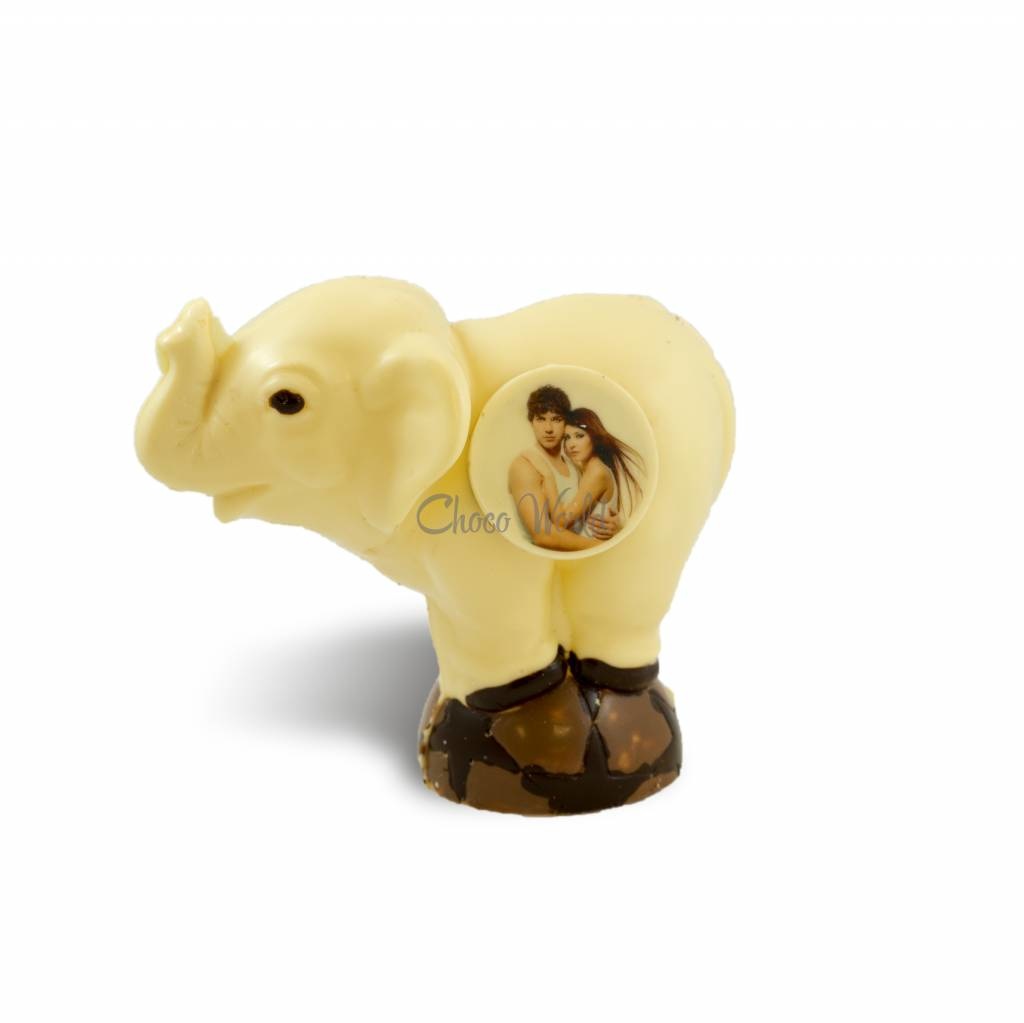 Een van de grootste dieren op aarde zijn olifanten. Ze boezemen ontzag in en zijn tegelijk heel vertederend. En dat geldt zeker voor onze Chocolade olifant met foto in de smaken puur, melk en wit. Wie ga jij blij mee maken met dit schattige exemplaar gemaakt van onze zalig, zoete en krachtige chocolade? Door er een foto van jezelf of jullie samen op te laten zetten maak je er een heel persoonlijk cadeau van. Daar zul je jong en oud blij mee maken. De Chocolade Olifant trompettert vrolijk terwijl hij behendig kunstjes uitvoert op de chocolade bal in de twee andere chocolade smaken.