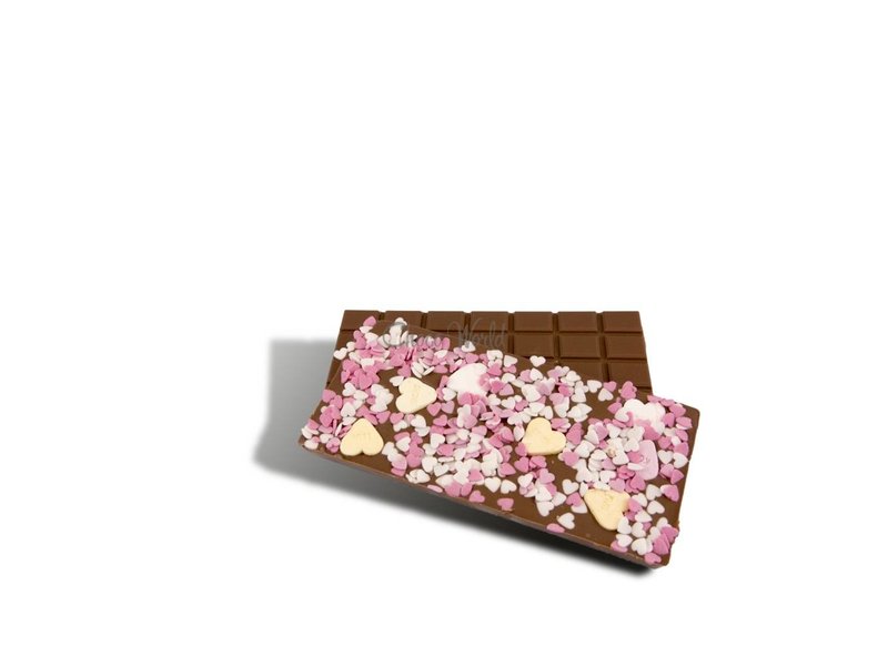 Is het Valentijnsdag of heb je een persoonlijke reden waarom je je vriend, je kind of hartsvriendin wilt laten weten hoe enorm jouw liefde voor hen is? Doe dat dan middels deze grote chocoladereep die aan de achterzijde is bestrooid met echte snoep- en liefdeshartjes! Aaah, als dat niet zoet is?!