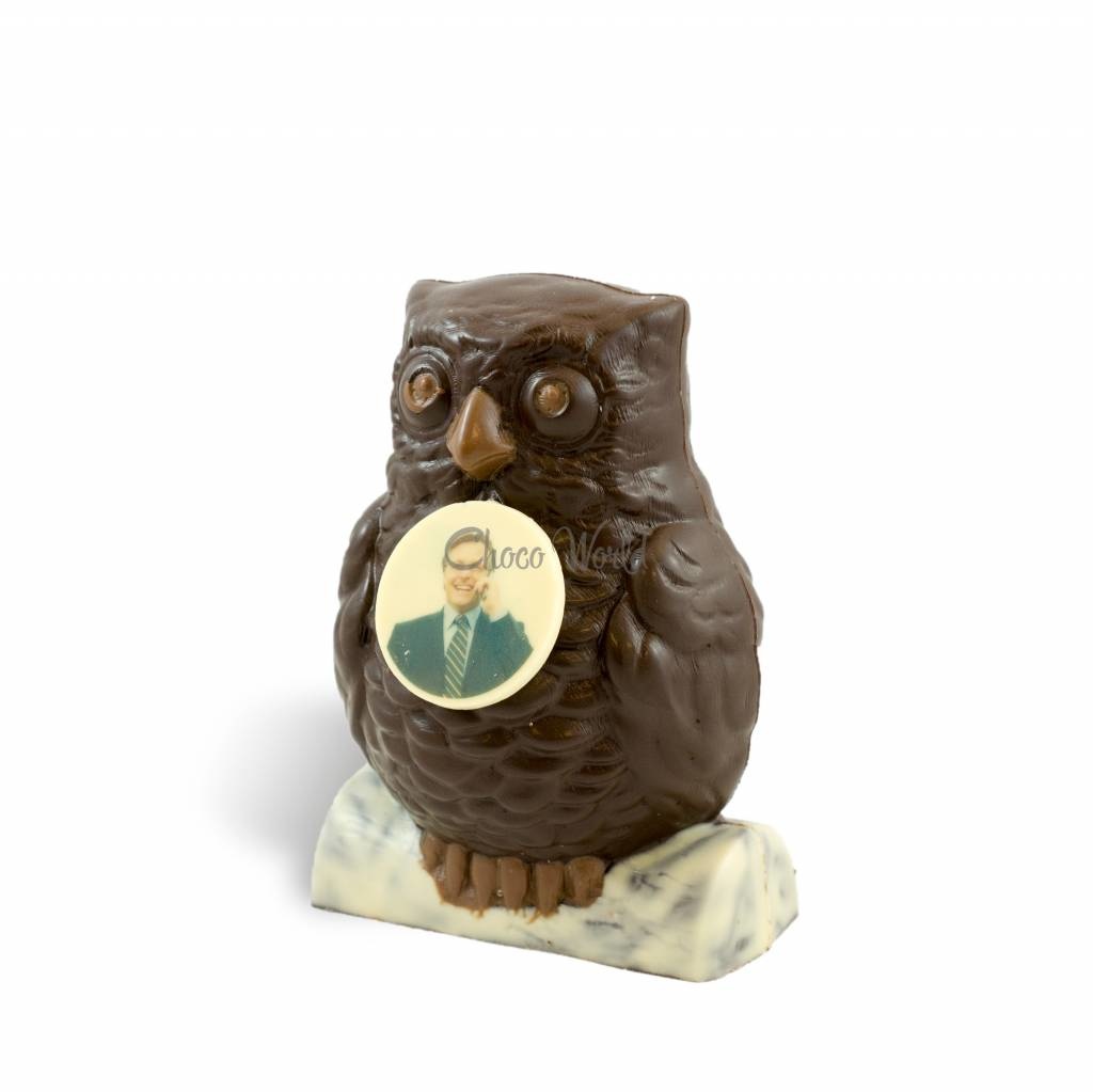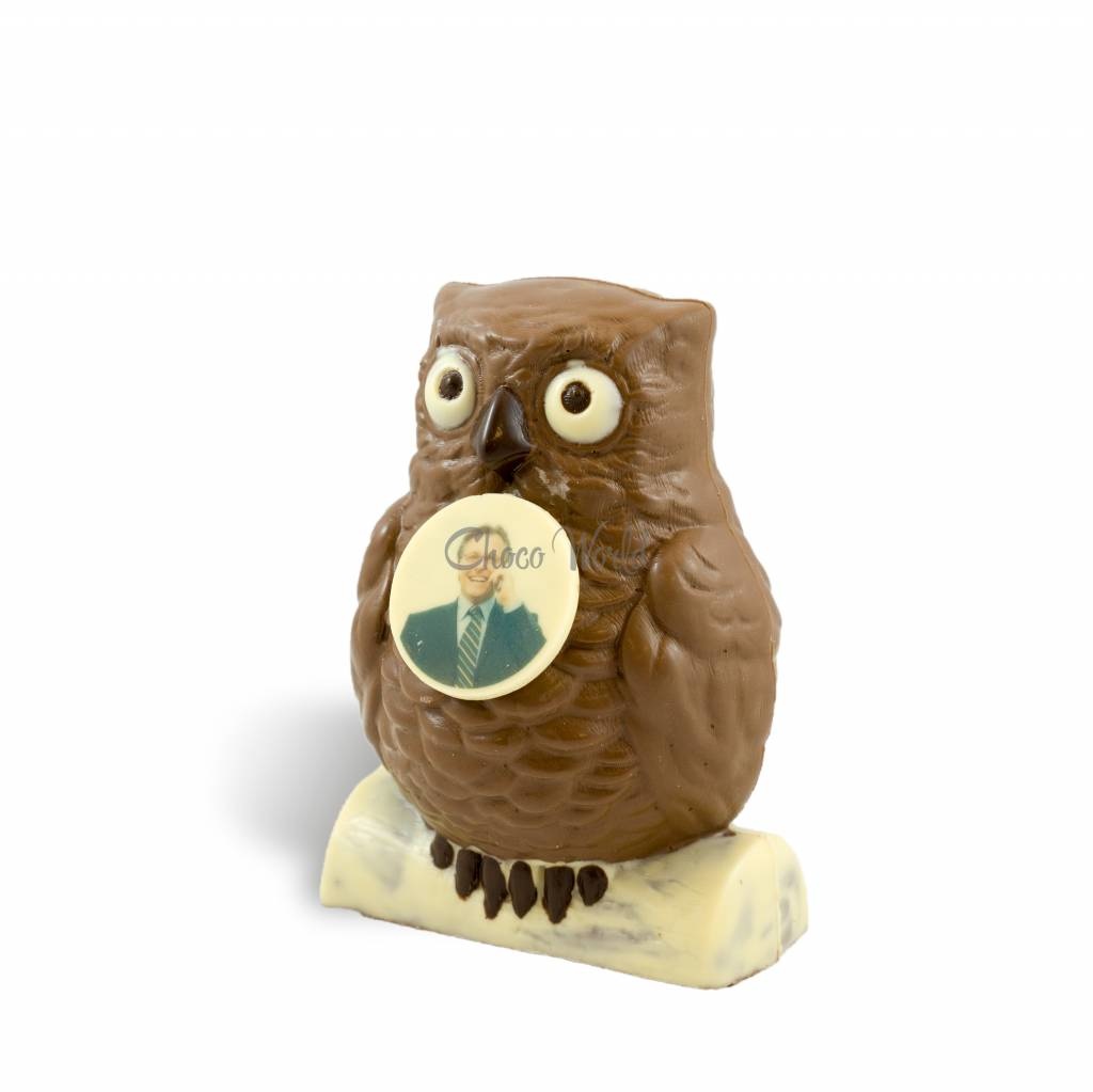Naar Chocolade Fabeltjesland bij iemand thuis deze keer. Want in ons ruime assortiment Chocolade figuren vind je ook veel dieren die in het Grote Dierenbos leven. Net als deze prachtige meneer de Uil zelf. Maar dan uitgevoerd in een van onze drie heerlijke verschillende chocolade soorten als romig wit, zachte melk en krachtige pure chocolade. De accenten als ogen, snavel, pootjes en de tak waarop hij zit zijn uitgevoerd in de andere twee contrasterende chocolade kleuren. En deze keer vertelt meneer de Uil niet uit de Fabeltjeskrant. Hij komt met een persoonlijke boodschap voor de jarige, jubilaris, geslaagde enzovoort in de vorm van een foto of tekst die trots op zijn gevederde borst prijkt.